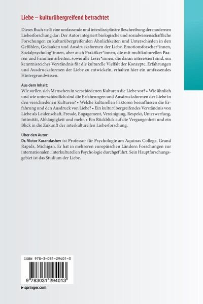 "Lange Zeit galt die Liebe als Forschungsgegenstand nur in einem Teil der Weltkulturen, doch heute wissen wir, dass sie universell ist, wenn auch mit vielen kulturellen Unterschieden in Bedeutung, Form und Ausdruck. Darüber hinaus hat die Liebe eine reiche Geschichte der Wissenschaft in verschiedenen Disziplinen hervorgebracht. Vor diesem Hintergrund hat Karandashev einen bemerkenswert umfassenden Überblick darüber verfasst, wie Menschen ihre Gefühle in der Liebe erleben und ausdrücken. Dieses Buch, welches das Thema aus einer wirklich internationalen und interdisziplinären Perspektive behandelt, ist eine unverzichtbare Wissensquelle über kulturelle und kulturübe