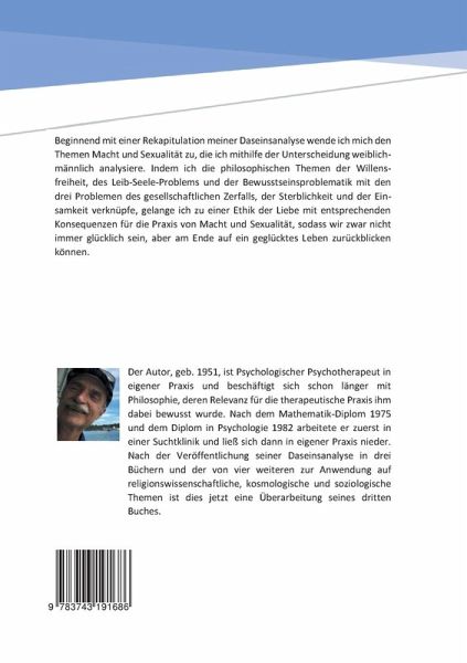 Beginnend mit einer Rekapitulation meiner Daseinsanalyse wende ich mich den Themen Macht und Sexualität zu, die ich mithilfe der Unterscheidung weiblich-männlich analysiere. Indem ich die philosophischen Themen der Willensfreiheit, des Leib-Seele-Problems und der Bewusstseinsproblematik mit den drei Problemen des gesellschaftlichen Zerfalls, der Sterblichkeit und der Einsamkeit verknüpfe, gelange ich zu einer Ethik der Liebe mit entsprechenden Konsequenzen für die Praxis von Macht und Sexualität, sodass wir zwar nicht immer glücklich sein, aber am Ende auf ein geglücktes Leben zurückblicken können.