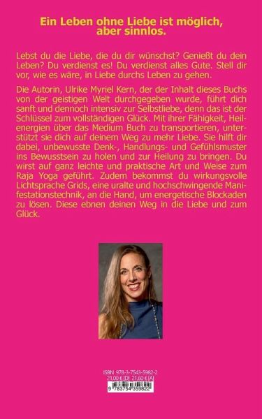 Lebst du die Liebe, die du dir wünscht? Genießt du dein Leben in vollen Zügen? Oder hast du deine Bedürfnisse hinter die der Familie, des Arbeitgebers und sonst aller anderen gestellt? Du verdienst mehr! Du verdienst alles Gute, was du dir vorstellen kannst. Stell dir vor, wie es wäre, mit Leichtigkeit und Freude durchs Leben zu gehen. Mit diesem Buch machst du den ersten Schritt auf den Weg dorthin. Die Autorin, Ulrike Myriel Kern, führt dich sanft und dennoch intensiv zur bedingungslosen Selbstliebe, denn das ist der Schlüssel zum vollständigen Glück. Mit ihrer Fähigkeit, Heilenergien über das Medium Buch zu transportieren, unterstützt dich Ulrike Myriel Kern auf deinem Weg. Sie hilft dir dabei, unbewusste Denk-, Handlungs- und Gefühlsmuster ins Bewusstsein zu holen und zur Heilung zu bringen. Du wirst auf ganz leichte und praktische Art und Weise zum Raja-Yoga geführt, womit du deine Gedanken kontrollieren kannst, und bekommst zudem Lichtsprache-Grids, eine uralte und hochschwingende Manifestationstechnik, an die Hand, um energetische Blockaden zu lösen. Diese ebnen deinen Weg in die Liebe und zum Glück. Erkenne, wie wertvoll du bist! Gib dich der Liebe hin und empfange das kostbare Geschenk, dass für dich bereit steht. Ein ideales Buch für alle, die bereit sind noch mehr Bewusstsein ins Leben zu bringen.
