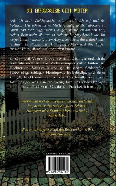 »Als ich mein Gleichgewicht verlor, schrie ich auf und fiel trotzdem. Das schien meine Mutter freudig jodelnd überhört zu haben. Mit weit aufgerissenen Augen starrte ich auf den Kopf meiner Besucherin, die nun in meinem Eingangsbereich lag. Ihr weisses Gesicht, die hellgrauen Augen. Sie schien direkt durch mich hindurch zu blicken. Ihr Atem ging schwer und ihre Lippen formten Worte, die ich nicht verstehen konnte...« Es ist so weit. Valerie Birbaum wird in Düdingen endlich ihr Buchcafé eröffnen. Die Vorbereitungen dafür laufen auf Hochtouren. Valeries Küche gleicht einem Schlachtfeld, Bärbel singt Schlager, Hemingway ist beleidigt, und als es klingelt, bricht eine Frau auf der Türschwelle zusammen. Das Einzige, was nun ein wenig Licht ins Chaos bringen könnte, ist ein Buch von 1821, das die Frau bei sich trug.