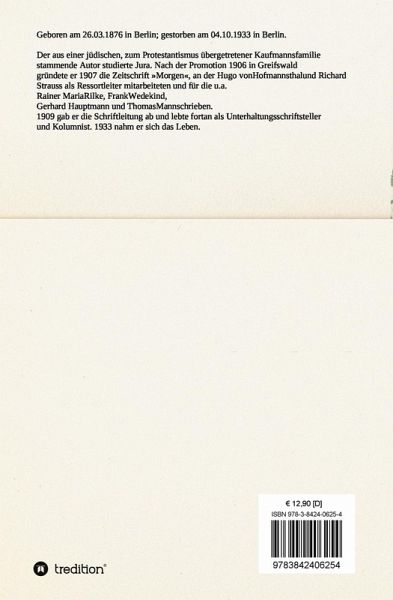 Geboren am 26.03.1876 in Berlin; gestorben am 04.10.1933 in Berlin.Der aus einer jüdischen, zum Protestantismus übergetretener Kaufmannsfamilie stammende Autor studierte Jura. Nach der Promotion 1906 in Greifswald gründete er 1907 die Zeitschrift »Morgen«, an der Hugo vonHofmannsthalund Richard Strauss als Ressortleiter mitarbeiteten und für die u.a. Rainer MariaRilke, FrankWedekind, Gerhard Hauptmann und ThomasMannschrieben. 1909 gab er die Schriftleitung ab und lebte fortan als Unterhaltungsschriftsteller und Kolumnist. 1933 nahm er sich das Leben.