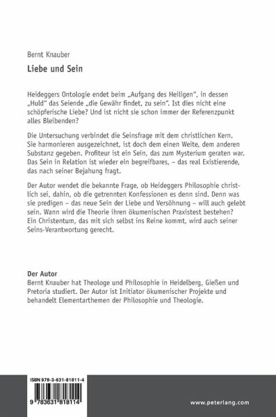 Heideggers Ontologie endet beim «Aufgang des Heiligen», in dessen «Huld» das Seiende «die Gewähr findet, zu sein». Ist dies nicht eine schöpferische Liebe? Und ist nicht sie schon immer der Referenzpunkt alles Bleibenden? Die Untersuchung verbindet die Seinsfrage mit dem christlichen Kern. Sie harmonieren ausgezeichnet, ist doch dem einen Weite, dem anderen Substanz gegeben. Profiteur ist ein Sein, das zum Mysterium geraten war. Das Sein in Relation ist wieder ein begreifbares, - das real Existierende, das nach seiner Bejahung fragt. Der Autor wendet die bekannte Frage, ob Heideggers Philosophie christlich sei, dahin, ob die getrennten Konfessionen es denn sind. Denn was sie predigen - das neue Sein der Liebe und Versöhnung - will auch gelebt sein. Wann wird die Theorie ihren ökumenischen Praxistest bestehen? Ein Christentum, das mit sich selbst ins Reine kommt, wird auch seiner Seins-Verantwortung gerecht.