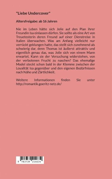 "Liebe Undercover"Altersfreigabe: ab 16 JahrenNie im Leben hätte sich Jolie auf den Plan ihrer Freundin Isa einlassen dürfen. Sie sollte als eine Art von Treuetesterin deren Freund auf einer Dienstreise in Italien überwachen. Was am Anfang vielleicht nur verrückt geklungen hatte, das stellt sich zunehmend als schwierig dar, denn Thomas ist äußerst attraktiv und eigentlich genau das, was Jolie sich von einem Mann erwartet. Kann sie der Versuchung widerstehen, von der verbotenen Frucht zu naschen? Das ehemalige Model steckt schon bald in der Klemme zwischen der Loyalität Isa gegenüber und den eigenen Bedürfnissen nach Nähe und Zärtlichkeit.Weitere Informationen finden Sie unter http://romantik.goeritz-netz.de