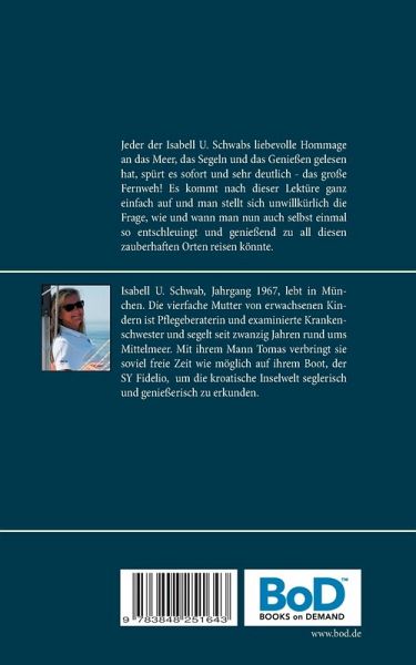 Isabell Schwab, Jahrgang 1967, lebt in München. Sie ist Pflegeberaterin und examinierte Krankenschwester, vierfache Mutter von erwachsenen Kinder und segelt seit mehr als zwanzig Jahren rund ums Mittelmeer. Mit Ihrem Mann Tomas verbringt sie heute soviel Zeit wie nur möglich auf ihrem Segelboot, der SY Fidelio, um die kroatische Inselwelt seglerisch und genießerisch zu erkunden. In Ihrem ersten Buch "Liebe, Wind und Meer - Segeln. Kochen und Genießen - Eine kleine Anleitung zur Entschleunigung (Books On Demand, Norderstedt, 2017, ISBN: 9783848251643) präsentierte sie bereits eine liebevolle Hommage an das Meer, das Segeln und das Genießen.