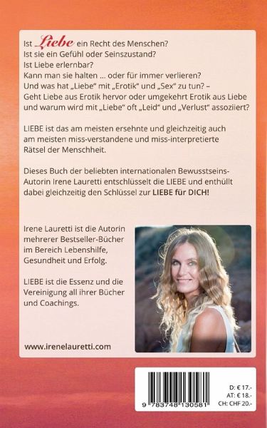 Ist LIEBE ein Recht des Menschen? Ist sie ein Gefühl oder Seinszustand? Ist Liebe erlernbar? Kann man sie halten ... oder für immer verlieren? Und was hat "Liebe" mit "Erotik" und "Sex" zu tun? - Geht Liebe aus Erotik hervor oder umgekehrt Erotik aus Liebe und warum wird mit "Liebe" so oft "Leid" und "Verlust" assoziiert?LIEBE ist das am meisten ersehnte und gleichzeitig auch am meisten missverstandene und missinterpretierte Rätsel der Menschheit.Dieses Buch der beliebten internationalen Bewusstseins-Autorin Irene Lauretti entschlüsselt die LIEBE und enthüllt dabei gleichzeitig den Schlüssel zur LIEBE für DICH!