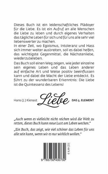 Dieses Buch ist ein leidenschaftliches Plädoyer für die Liebe.Es ist ein Aufruf an alle Menschen die Liebe zu leben, und durch eigenes Verhalten das tägliche Leben für sich, und für uns alle, sehr viel liebenswerter zu machen.In einer Zeit, wo Egoismus, Intoleranz und Hass sich immer weiter ausbreiten, soll es dabei helfen, das wichtigste Gegenmittel, die Nächstenliebe, wieder zu beleben.Das Buch soll einen Weg zeigen, wie jeder einzelne sein eigenes Leben und das Leben anderer auf einfache Art und Weise positiv beeinflussen kann und dabei die Macht der Liebe entdeckt. Es führt zu der wunderbaren Erkenntnis:Die Liebe ist die Quintessenz des Lebens!Auch wenn es vielleicht nicht reichen wird die Welt zu retten, dieses Buch kann neue Lust am Leben wecken.Ein Buch, das zeigt, wie viel schöner das Leben für uns alle sein kann, wenn wir es nur wirklich wollen.