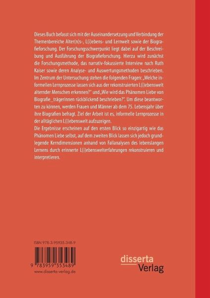 Dieses Buch befasst sich mit der Auseinandersetzung und Verbindung der Themenbereiche Alter(n)s-, L(i)ebens- und Lernwelt sowie der Biografieforschung. Der Forschungsschwerpunkt liegt dabei auf der Beschreibung und Ausführung der Biografieforschung. Hierzu wird zunächst die Forschungsmethode, das narrativ-fokussierte Interview nach Ruth Kaiser sowie deren Analyse- und Auswertungsmethoden beschrieben. Im Zentrum der Untersuchung stehen die folgenden Fragen: "Welche informellen Lernprozesse lassen sich aus der rekonstruierten L(i)ebenswelt alternder Menschen erkennen?" und "Wie wird das Phänomen Liebe von Biografie_trägerinnen rückblickend beschrieben?". Um diese beantworten zu können, werden Frauen und Männer ab dem 75. Lebensjahr über ihre Biografien befragt. Ziel der Arbeit ist es, informelle Lernprozesse in der alltäglichen L(i)ebenswelt aufzuzeigen. Die Ergebnisse erscheinen auf den ersten Blick so einzigartig wie das Phänomen Liebe selbst, auf dem zweiten Blick lassen sich jedoch grundlegende Kerndimensionen anhand von Fallanalysen des lebenslangen Lernens durch erinnerte L(i)ebenswelterfahrungen rekonstruieren und interpretieren.