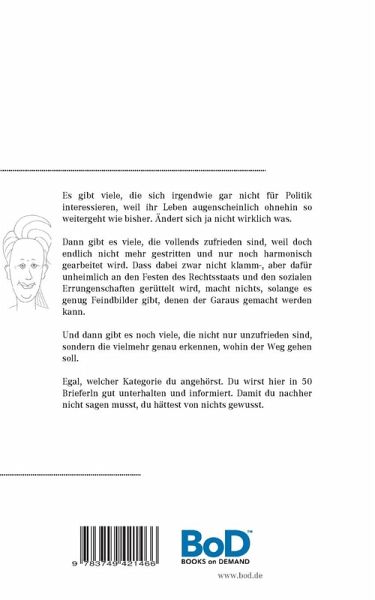 Es gibt viele, die sich irgendwie gar nicht für Politik interessieren, weil ihr Leben augenscheinlich ohnehin so weitergeht wie bisher. Ändert sich ja nicht wirklich was. Dann gibt es viele, die vollends zufrieden sind, weil doch endlich nicht mehr gestritten und nur noch harmonisch gearbeitet wird. Dass dabei zwar nicht klamm-, aber dafür unheimlich an den Festen des Rechtsstaats und den sozialen Errungenschaften gerüttelt wird, macht nichts, solange es genug Feindbilder gibt, denen der Garaus gemacht werden kann.Und dann gibt es noch viele, die nicht nur unzufrieden sind, sondern die vielmehr genau erkennen, wohin der Weg gehen soll.Egal, welcher Kategorie du angehörst. Du wirst hier in 50 Brieferln gut unterhalten und informiert. Damit du nachher nicht sagen musst, du hättest von nichts gewusst.