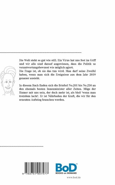 Die Welt steht so gut wie still. Ein Virus hat uns fest im Griff und wir alle sind darauf angewiesen, dass die Politik so verantwortungsbewusst wie möglich agiert.Die Frage ist, ob sie das tun wird. Man darf seine Zweifel haben, wenn man sich die Ereignisse aus dem Jahr 2019 genauer ansieht.In diesem Buch finden sich die Brieferl No.201 bis No.250 an den ehemals besten Innenminister aller Zeiten. Möge der Humor mit uns sein, der doch mehr ist, als bloß 'wenn man trotzdem lacht'. Er ist Nährboden der Kraft, die wir für den erneuten Aufstieg brauchen werden.