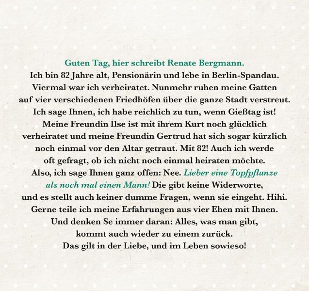 "Alles, was man gibt, kommt auch wieder zu einem zurück. Das gilt in der Liebe und im Leben sowieso." Eine humorvolle Geschenkidee zur Verlobung oder Hochzeit und ein wunderbares Geschenk für alle Renate-Bergmann-Fans.