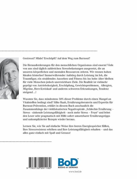 Gestresst? Müde? Erschöpft? Auf dem Weg zum Burnout? Die Herausforderungen für den menschlichen Organismus sind enorm! Viele von uns sind täglich zahlreichen Stressbelastungen ausgesetzt, die an unseren körperlichen und mentalen Ressourcen zehren. Wir rennen hohen Idealen hinterher! Immerwährender Aufstieg durch Leistung im Job, die Traumfigur, ein strahlendes Aussehen und Fitness bis ins hohe Alter bleiben für viele Menschen jedoch unerreichbare Ziele. Die Realität ist vielmehr geprägt von Antriebslosigkeit, Erschöpfung, Gewichtsproblemen, Allergien, Migräne, Herz-Kreislauf- und anderen schweren Erkrankungen, Tendenz steigend ...!Wussten Sie, dass mindestens 50% dieser Probleme durch einen Mangel an Vitalstoffen bedingt sind? Silke Raab, Ernährungsberaterin und Expertin für Burnout-Prävention, erklärt in diesem Buch anschaulich die Zusammenhänge der vieldiskutierten Negativspirale "Schlechte Ernährung - Stress - sinkende Leistungsfähigkeit - noch mehr Stress - Frust" und leitetden Leser sehr pragmatisch mit Hilfe sofort umsetzbarer Ernährungstipps und unkomplizierter Rezepte wieder heraus.Lernen Sie, wie Sie auf einfache Weise ihre leeren Energiespeicher füllen, Ihre Stressresistenz erhöhen und Ihre Leistungsfähigkeit erhalten - und das alles ganz einfach mit Spaß und Genuss!