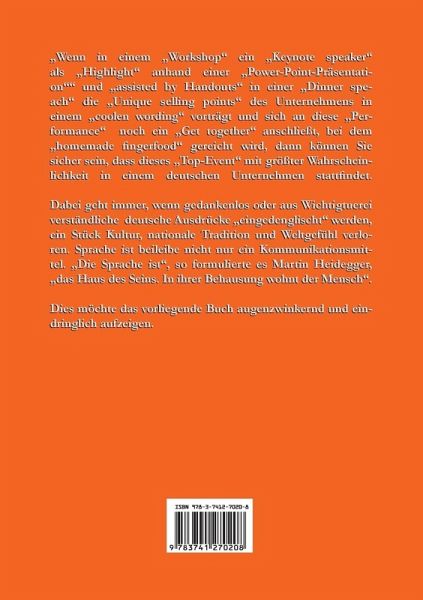 Wenn in einem "Workshop" ein "Keynote speaker" als "Highlight" anhand einer "Power-Point-Präsentation" und "assisted by Handouts" in einer "Dinner speach" die "Unique selling points" des Unternehmens in einem "coolen wording" vorträgt und sich an diese "Performance" noch ein "Get together" anschließt, bei dem "homemade fingerfood" gereicht wird, dann können Sie sicher sein, dass dieses "Top Event" mit größter Wahrscheinlichkeit in einem deutschen Unternehmen stattfindet.Dabei gehen immer, wenn gedankenlos oder aus Wichtigtuerei verständliche deutsche Ausdrücke "eingedenglischt" werden, ein Stück Kultur, nationale Tradition und Weltgefühl verloren. Sprache ist beileibe nicht nur ein Kommunikationsmittel. "Die Sprache ist", so formulierte es Martin Heidegger, "das Haus des Seins. In ihrer Behausung wohnt der Mensch".Dies möchte das vorliegende Buch augenzwinkernd und eindringlich aufzeigen.