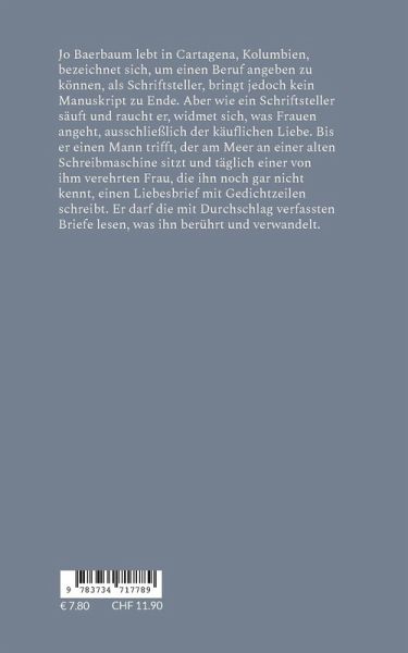 Jo Baerbaum lebt in Cartagena, Kolumbien, bezeichnet sich, um einen Beruf angeben zu können, als Schriftsteller, bringt jedoch kein Manuskript zu Ende. Aber wie ein Schriftsteller säuft und raucht er, widmet sich, was Frauen angeht, ausschließlich der käuflichen Liebe. Bis er einen Mann trifft, der am Meer an einer alten Schreibmaschine sitzt und täglich einer von ihm verehrten Frau, die ihn noch gar nicht kennt, einen Liebesbrief mit Gedichtzeilen schreibt. Er darf die mit Durchschlag verfassten Briefe lesen, was ihn berührt und verwandelt.