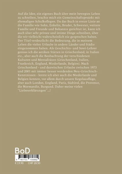 Auf die Idee, ein eigenes Buch über mein bewegtes Leben zu schreiben, brachte mich ein Gemeinschaftsprojekt mit ehemaligen Schulkollegen. Da das Buch in erster Linie an die Familie wie Sohn, Enkelin, Bruder, Schwester, weitere Familie und Freunde und Bekannte gerichtet ist, kann ich auch über sehr private und intime Dinge schreiben, über die wir vielleicht wahrscheinlich nie gesprochen haben.Der Titel verdeutlicht die Bedeutung, die in meinem Leben die vielen Urlaube in andere Länder und Städte eingenommen haben. Als Geschichts- und Sowi-Lehrer genoss ich die antiken Stätten in Griechenland, in Italien etc., aber auch die Beobachtung der verschiedenen Kulturen und Mentalitäten (Griechenland, Italien, Frankreich, England, Niederlande, Belgien). Nach Griechenland - und dazwischen Urlaube zwischen 1973 und 2001 mit immer besser werdenden Neu-Griechisch-Kenntnissen - lernte ich aber auch die Niederlande und Belgien kennen, vor allem durch unsere Kegelausflüge, aber auch London, England, Paris, Südtirol, die Provence, die Normandie, Burgund. Daher meine vielen "Liebeserklärungen"...!