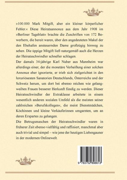 "Würden die Köchinnen und Dienstmädchen auch etwas anderes lesen als nur die Zeitungsseiten mit den Heiratsannoncen, müsste ich mir weniger oft die dreisten Lügen solcher Kerle anhören", so der müde Seufzer eines Staatsanwaltes während des Gerichtsprozesses gegen einen Heiratsschwindler im Jahr 1898. Für den Juristen war es schon die fünfte Verhandlung gegen einen Liebesgauner innerhalb eines Monats. Die Zeitungen berichteten oft und meist sehr ausführlich von betrogenen Frauen, deren Heiratssehnsüchte von skrupellosen Männern schamlos ausgenutzt wurden und deren Ehetraum sich nach wenigen Wochen ebenso in Luft auflöste wie der Geldwert ihres Sparbuches. Warnungen vor solchen Betrügern gab es genug. Aber wenn das Weibervolk nur die Heiratsannoncen liest, dann ... ! Auf die Dauer unverheiratet sein - gar als "spätes Mädchen" zu gelten, das war noch in der späten Kaiserzeit eine Horrorvorstellung für fast jede Frau. Das Begehren, endlich vor den Traualtar zu treten, vielleicht hatte man das dreißigste Lebensjahr ja schon überschritten, ließ Zweifel an der Untadeligkeit des Bräutigams nicht zu. Dem meist redegewandten Betrüger wurde leichtfertig das Herz, der Körper und die Geldbörse geöffnet.Die für dieses Buch aus dem Zeitraum eines halben Jahrhunderts ausgewählten wahren Begebenheiten zeigen den Heiratsschwindel in seinen vielen Facetten. Manches ist zum Lachen und anderes zum Weinen.
