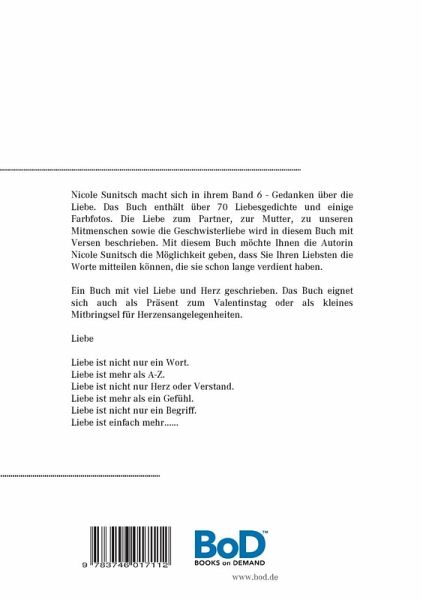 Nicole Sunitsch macht sich in ihrem Band 6 - Gedanken über die Liebe. Das Buch enthält über 70 Liebesgedichte. Die Liebe zum Partner, zur Mutter, zu unseren Mitmenschen sowie die Geschwisterliebe wird in diesem Buch in Versen wieder gegeben. Mit diesem Buch möchte Ihnen die Autorin Nicole Sunitsch die Möglichkeit geben, dass Sie Ihren Liebsten die Worte mitteilen können, die sie schon lange verdient haben. Ein Buch mit viel Liebe und mit Herz geschrieben. Das Buch eignet sich auch als Präsent zum Valentinstag. Ein liebevolles Mitbringsel für Herzensangelegenheiten. LiebeLiebe ist nicht nur ein Wort.Liebe ist mehr als A-Z.Liebe ist nicht nur Herz oder Verstand.Liebe ist mehr als ein Gefühl.Liebe ist nicht nur ein Begriff.Liebe ist einfach mehr ...