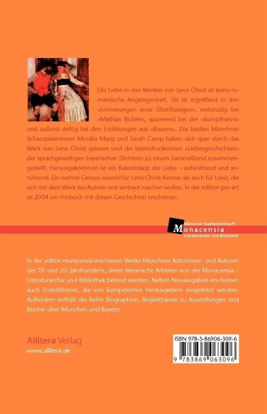 Die Liebe in den Werken von Lena Christ ist keine romantische Angelegenheit. Sie ist ergreifend in den "Erinnerungen einer Überflüssigen", wehmütig bei "Mathias Bichler", spannend bei der "Rumplhanni" und äußerst deftig bei den Erzählungen aus "Bauern". Die beiden Münchner Schauspielerinnen Monika Manz und Sarah Camp haben sich quer durch das Werk von Lena Christ gelesen und die beeindruckensten "Liebesgeschichten" der sprachgewaltigen bayerischen Dichterin zu einem Sammelband zusammengestellt. Herausgekommen ist ein Kaleidoskop der Liebe aufwühlend und anrührend. Ein wahrer Genuss sowohl für Lena Christ-Kenner als auch für Leser, die sich mit dem Werk der Autorin erst vertraut machen wollen. In der edition pro art ist 2004 ein Hörbuch mit diesen Geschichten erschienen.