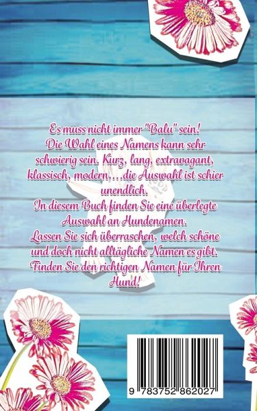 Es muss nicht immer "Balu" sein!Die Wahl eines Namens kann sehr schwierig sein. Kurz, lang, extravagant, klassisch, modern,...die Auswahl ist schier unendlich. In diesem Buch finden Sie eine überlegte Auswahl an Hundenamen.Lassen Sie sich überraschen, welch schöne und doch nicht alltägliche Namen es gibt. Finden Sie den richtigen Namen für Ihren Hund!