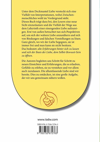 Unter dem Deckmantel Liebe versteckt sich eine Vielfalt von Interpretationen, wobei Zwischenmenschliches wohl im Vordergrund steht. Dieses Buch trägt dazu bei, den Lesern eine neue Sicht einzuräumen und die Vielfalt der Wege aus dem Labyrinth einer einengenden Liebe aufzuzeigen. Erst von aussen betrachtet tun sich Pespektiven auf, um sich der wahren Liebe anzunähern und sich von Bindungen und falschen Vorstellungen zu lösen. Ganz gleich, wo wir der Liebe begegnen, sie ist immer frei und man kann sie nicht besitzen. Das bedeutet: alte Erfahrungen hinter sich zu lassen und sich der Basis der Liebe, dem Selbst-Bewusst-Sein zu öffnen.Die Autoren begleiten uns Schritt für Schritt zu neuen Einsichten und Erfahrungen, die es erlauben, Gefühle zu erleben, sie zu verstehen und vor allem auch zuzulassen. Die allumfassende Liebe sind wir bereits. Dies zu entdecken, ist eine grosse Aufgabe, der wir uns gemeinsam nähern wollen.