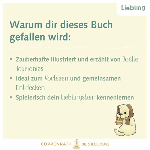Interaktiver Schieber für noch mehr SpaßZauberhafte Illustrationen und erzählt von Joëlle TourloniasIdeal zum Vorlesen und gemeinsamen EntdeckenSpielerisches Lernen rund um Hunde für Kinder ab 18 Monaten