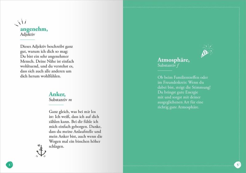 Es gibt diese Menschen in deinem Leben, die ganz besonders wichtig für dich sind? Mit diesem Buch kannst du deinen Lieblingsmenschen Danke sagen für all das, was sie so einzigartig und wertvoll macht! Denn in diesem modernen Geschenkbuch sind 50 Stichwörter versammelt, die von A bis Z aufzählen, was du an dieser Person so sehr schätzt und liebst.