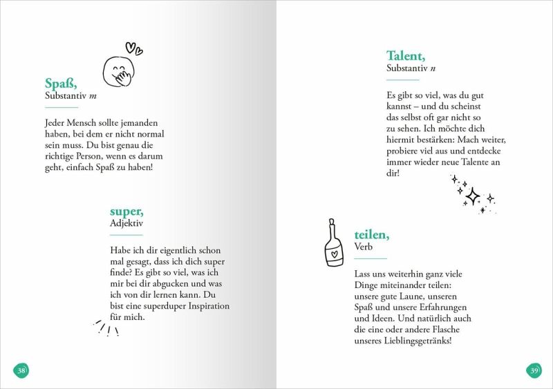 Dieses schöne Geschenk versammelt 50 Gründe, warum der / die Beschenkte von A bis Z einfach super ist. Zum immer wieder Hineinblättern, Schmunzeln und Sichfreuen - ein originelles Präsent für alle, die man von Herzen gern hat. Für Freunde und Freundinnen, Omas und Opas, Töchter und Söhne, Mütter und Väter, Familienmitglieder und liebe Nachbar:innen - für all diejenigen, die unser Leben erst so richtig schön machen!