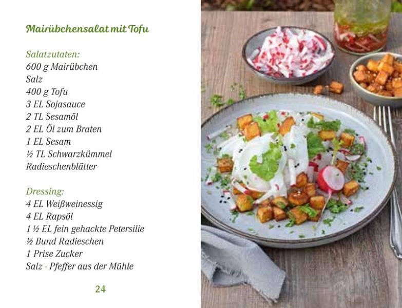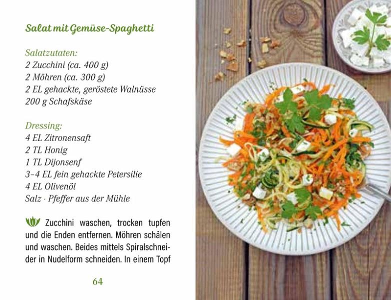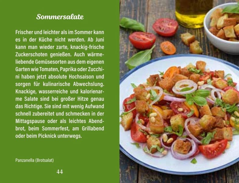 Lange Zeit als Grünfutter verschrien, klettern Salate heute auf unse-rem Speiseplan weit nach oben. Ob als Haupt- oder Vorspeise, je bunter sie angerichtet werden, umso mehr Vital- und Mineralstoffe enthalten Salate und tragen so zu einer gesunden, ausgewogenen Ernährung bei. Salate schmecken einfach zu jeder Jahreszeit und sind alles andere als langweilig. Sie eignen sich als Alltagskost, als Pausensnack zum Mitnehmen, für die Gartenparty oder andere festliche Anlässe. Das Buch empfiehlt vom Frühling bis in den Winter vielfältige, vitaminreiche und sehr wohlschmeckende Salate mit saisonalem Gemüse, Obst, Extrazutaten, verschiedenen Aromen und Gewürzen. Die Autorin hat aus ihrem Rezeptfundus einfache und schnelle Salate, neue Kreationen wie auch einige Ideen aus fernen Ländern ausgewählt, sodass für jeden Geschmack etwas dabei ist