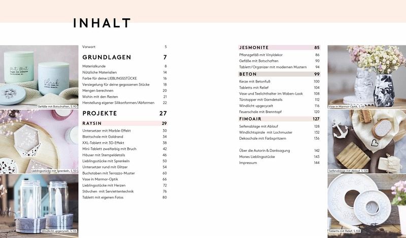 Im ausführlichen Grundlagenteil werden die unterschiedlichen Materialien Raysin, Jesmonite, Beton und FIMOair miteinander verglichen, sowie verschiedene Farb- und Mustervarianten, z.B. die effektvolle Terrazzo-Technik, gezeigt. Zusätzlich wird noch erklärt, wie man eigene Silikonformen herstellen kann. So kann man sein neues Hobbby noch individueller gestalten.