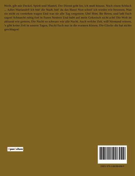 Weib, gib mir Deckel, Spieß und Mantel, Der Dienst geht los, ich muß hinaus. Noch einen Schluck ... Adies Mariandel! Ich hüt' die Stadt, hüt' du das Haus! Nun schrei' ich wieder wie besessen, Was sie nicht zu verstehen wagen Und was sie alle Tag vergessen: Uht! Hört, Ihr Herrn, und laßt Euch sagen! Schnarcht ruhig fort in Euren Nestern Und habt auf mein Gekreisch nicht acht! Die Welt ist akkurat wie gestern, Die Nacht so schwarz wie alle Nacht. Auch welche Zeit, will Niemand wissen, 's gibt keine Zeit in unsren Tagen, Duckt Euch nur in die warmen Kissen, Die Glocke die hat nichts geschlagen!
