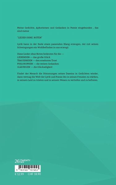 Meine Gedichte, Aphorismen und Gedanken in Poesie eingebunden , das sind meine "LIEDER OHNE NOTEN"Lyrik kann in der Seele einen passenden Klang erzeugen, der mit seinen Schwingungen ein Wohlbefinden in uns erzeugt.Diese Lieder ohne Noten bedeuten für die ---LIEBENDEN --- das große GlückTRAUERNDEN --- den ersehnten TrostPHILOSOPHEN --- die weisen GedankenGLÄUBIGEN --- die Glückseligkeit Findet der Mensch die Stimmungen seines Daseins in Gedichten wieder, dann vermag die Welt der Lyrik und Poesie ihn in seinen Freuden zu stärken, in seinem Leid zu trösten und in seinem Wesen zu vertiefen und zu befreien.