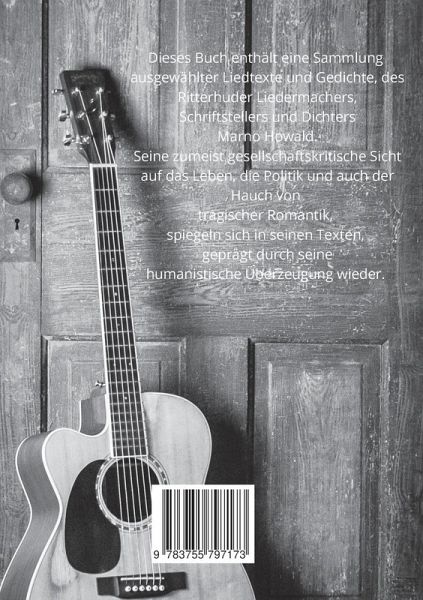 Dieses Buch enthält eine Sammlung ausgewählter Liedtexte und Gedichte, des Ritterhuder Liedermachers, Schriftstellers und Dichters Marno Howald.Seine zumeist gesellschaftskritische Sicht auf das Leben, die Politik und auch der Hauch von tragischer Romantik, spiegeln sich in seinen Texten, geprägt durch seine humanistische Überzeugung wieder.
