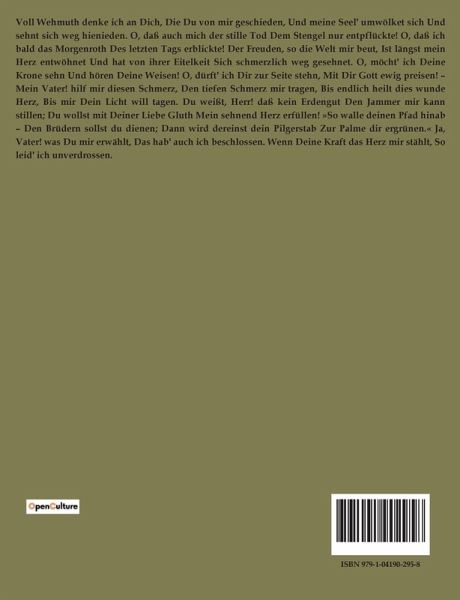 Voll Wehmuth denke ich an Dich, Die Du von mir geschieden, Und meine Seel' umwölket sich Und sehnt sich weg hienieden. O, daß auch mich der stille Tod Dem Stengel nur entpflückte! O, daß ich bald das Morgenroth Des letzten Tags erblickte! Der Freuden, so die Welt mir beut, Ist längst mein Herz entwöhnet Und hat von ihrer Eitelkeit Sich schmerzlich weg gesehnet. O, möcht' ich Deine Krone sehn Und hören Deine Weisen! O, dürft' ich Dir zur Seite stehn, Mit Dir Gott ewig preisen! ¿ Mein Vater! hilf mir diesen Schmerz, Den tiefen Schmerz mir tragen, Bis endlich heilt dies wunde Herz, Bis mir Dein Licht will tagen. Du weißt, Herr! daß kein Erdengut Den Jammer mir kann stillen; Du wollst mit Deiner Liebe Gluth Mein sehnend Herz erfüllen! »So walle deinen Pfad hinab ¿ Den Brüdern sollst du dienen; Dann wird dereinst dein Pilgerstab Zur Palme dir ergrünen.« Ja, Vater! was Du mir erwählt, Das hab' auch ich beschlossen. Wenn Deine Kraft das Herz mir stählt, So leid' ich unverdrossen.