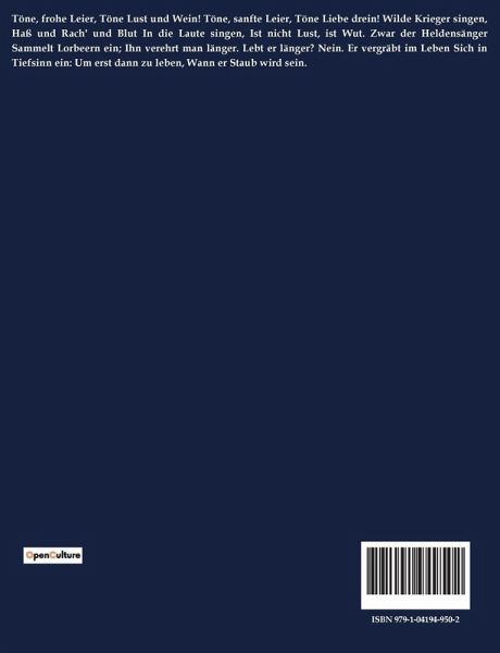 Töne, frohe Leier, Töne Lust und Wein! Töne, sanfte Leier, Töne Liebe drein! Wilde Krieger singen, Haß und Rach' und Blut In die Laute singen, Ist nicht Lust, ist Wut. Zwar der Heldensänger Sammelt Lorbeern ein; Ihn verehrt man länger. Lebt er länger? Nein. Er vergräbt im Leben Sich in Tiefsinn ein: Um erst dann zu leben, Wann er Staub wird sein.