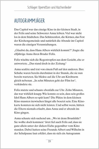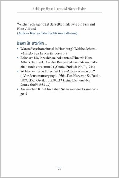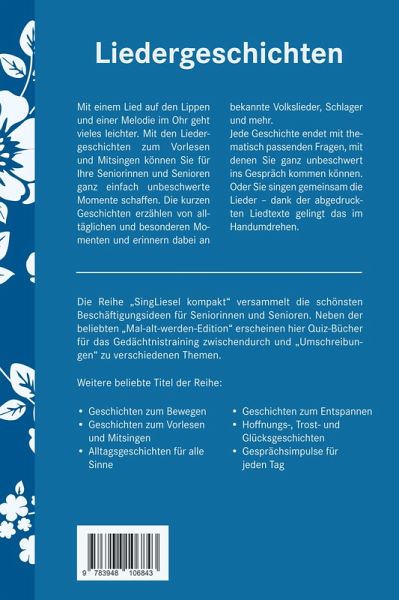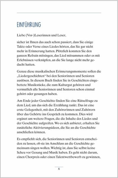 Mit einem Lied auf den Lippen und einer Melodie im Ohr geht vieles leichter. Mit den "Liedergeschichten zum Vorlesenund Mitsingen" können Sie für Ihre Seniorinnen und Senioren ganz einfach unbeschwerte Momente schaffen. Die kurzenGeschichten erzählen von alltäglichen und besonderen Momenten und erinnern dabei an bekannte Volkslieder, Schlagerund mehr. Jede Geschichte endet mit thematisch passenden Fragen, mit denen Sie ganz unbeschwert ins Gespräch kommen können. Oder Sie singen gemeinsam die Lieder - dank der abgedruckten Liedtexte gelingt das im Handumdrehen.