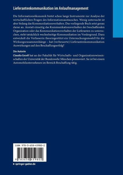 Die Informationsökonomik bietet schon lange Instrumente zur Analyse der wirtschaftlichen Fragen des Informationsaustausches. Wenig untersucht ist aber bislang das Kommunikationsverhalten. Das vorliegende Buch setzt genau daran an. Anstatt einseitig das Kommunikationsverhalten der beschaffenden Organisation oder das Kommunikationsverhalten der Lieferanten zu untersuchen, steht tatsächlich wechselseitige Kommunikation im Vordergrund. Dazu entwickelt die Verfasserin theoriegestützt ein Untersuchungsmodell für die Wirkungszusammenhänge - hat (verbesserte) Lieferantenkommunikation Auswirkungen auf den Beschaffungserfolg?