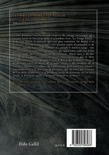 "Liens d'Ombre" est le second chapitre du voyage initiatique qu'a entamé Aslan-le-Taciturne dans le précédent livre "Le Visage Effacé". Redevenu Macis, le prénom que son père arménien lui donna à sa naissance, il va devoir accomplir une mission semée d'embuches et de dangers, loin du hameau de la Louve. Ce périple le mènera jusqu'à une mystérieuse cité ensevelie en Anatolie qui appartenait jadis aux Filles de la Grande Mère. Parvenu à la croisée des chemins, Macis aura à décider par lui-même quelle voie il va suivre. Mais qu'est-ce que le libre arbitre face aux forces qui gouvernent le destin des hommes. N'est-il qu'un jouet entre les mains de la rusée Séléna et des membres de sa famille ? Choisira-t-il l'amour qu'il porte à une belle guerrière-faucon ? Succombera-t-il à la tentation de puissance que lui offre une créature de l'au-delà ? Oubliera-t-il sa promesse sacrée de retrouver sa soeur et sa mère ? Les épreuves auxquelles sera soumis Macis l'ébranleront jusque dans ses fondements.