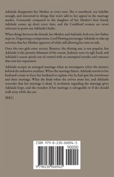 Adelaide disappoints her Mother at every turn. She is unrefined, not ladylike enough, and interested in things that won't add to her appeal in the marriage market. Constantly compared to the daughter of her Mother's best friend, Adelaide comes up short every time, and the Coulthard women are never reluctant to point out Adelaide's faults. When things between the friends, her Mother and Adelaide, boil over, her Father steps in. Organising a compromise, Lord Fleming encourages Adelaide to take up activities that her Mother approves of while still allowing her time to ride. Once the two girls enter society, Beatrice, the shining star, is not popular, while Adelaide is the season's premier debutant. Jealousy rears its ugly head, and Adelaide's season spirals out of control with an attempted murder and rumours that ruin her reputation. Adelaide accepts an arranged marriage when an investigator solves the mystery behind the unknown assailant. When the marriage falters, Adelaide travels to her husband's estate to force him to explain why he had quit the townhouse and their marriage. What she finds upon arrival stuns her, and Adelaide concedes that her marriage is dead. A revelation gives Adelaide hope, and she wonders whether it's salvageable or if she should walk away while she can.