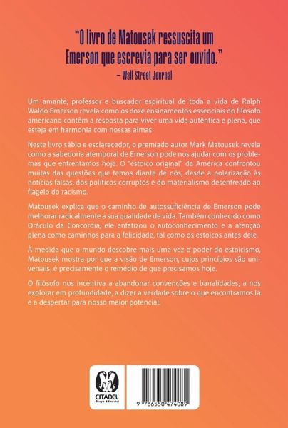 Um amante, professor e buscador espiritual de toda a vida de Ralph Waldo Emerson revela como os doze ensinamentos essenciais do filósofo americano contêm a resposta para viver uma vida autêntica e plena, que esteja em harmonia com nossas almas. Neste livro sábio e esclarecedor, o premiado autor Mark Matousek revela como a sabedoria atemporal de Emerson pode nos ajudar com os problemas que enfrentamos hoje. O ¿estoico original¿ da América confrontou muitas das questões que temos diante de nós, desde a polarização às notícias falsas, dos políticos corruptos e do materialismo desenfreado ao flagelo do racismo. Matousek explica que o caminho de autossuficiência de Emerson pode melhorar radicalmente a sua qualidade de vida. Também conhecido como Oráculo da Concórdia, ele enfatizou o autoconhecimento e a atenção plena como caminhos para a felicidade, tal como os estoicos antes dele. À medida que o mundo descobre mais uma vez o poder do estoicismo, Matousek mostra por que a visão de Emerson, cujos princípios são universais, é precisamente o remédio de que precisamos hoje. O filósofo nos incentiva a abandonar convenções e banalidades, a nos explorar em profundidade, a dizer a verdade sobre o que encontramos lá e a despertar para nosso maior potencial.