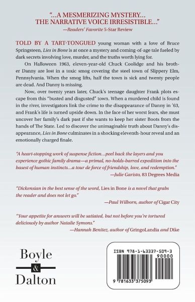 Told by a tart-tongued young woman with a love of Bruce Springsteen, Lies in Bone is at once a mystery and coming-of-age tale fueled by dark secrets involving love, murder, and the truths worth lying for. On Halloween 1963, eleven-year-old Chuck Coolidge and his brother Danny are lost in a toxic smog covering the steel town of Slippery Elm, Pennsylvania. When the smog lifts, half the town is sick and twenty people are dead. And Danny is missing. Now, over twenty years later, Chuck's teenage daughter Frank plots escape from this "busted and disgusted" town. When a murdered child is found in the river, investigators link the crime to the disappearance of Danny in '63, and Frank's life is turned upside down. In the face of her worst fears, she must uncover her family's dark past if she wants to keep her sister Boots from the hands of The State. Led to discover the unimaginable truth about Danny's disappearance, Lies in Bone culminates in a shocking eleventh-hour reveal and an emotionally charged finale.