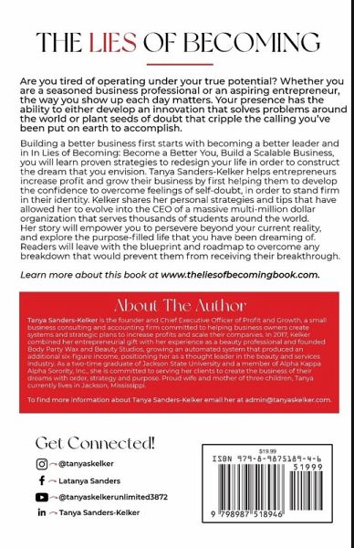 Are you tired of operating under your true potential? Whether you are a seasoned business professional or an aspiring entrepreneur, the way you show up each day matters. Your presence has the ability to either develop an innovation that solves problems around the world or plant seeds of doubt that cripple the calling you've been put on earth to accomplish. Building a better business first starts with becoming a better leader and in In Lies of Becoming: Become a Better You, Build a Scalable Business, you will learn proven strategies to redesign your life in order to construct the dream that you envision. Tanya Sanders-Kelker helps entrepreneurs increase profit and grow their business by first helping them to develop the confidence to overcome feelings of self-doubt, in order to stand firm in their identity. Kelker shares her personal strategies and tips that have allowed her to evolve into the CEO of a massive multi-million dollar organization that serves thousands of students around the world. Her story will empower you to persevere beyond your current reality, and explore the purpose-filled life that you have been dreaming of. Readers will leave with the blueprint and roadmap to overcome any breakdown that would prevent them from receiving their breakthrough. Learn more about this book at www.theliesofbecomingbook.com