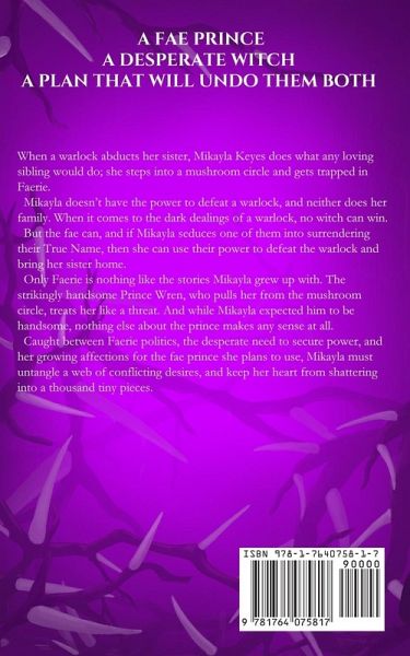 A FAE PRINCE. A DESPERATE WITCH. A PLAN THAT WILL UNDO THEM BOTH. When a warlock abducts her sister, Mikayla Keyes does what any loving sibling would do; she steps into a mushroom circle and gets trapped in Faerie. Mikayla doesn't have the power to defeat a warlock, and neither does her family. When it comes to the dark dealings of a warlock, no witch can win. But the fae can, and if Mikayla seduces one of them into surrendering their True Name, then she can use their power to defeat the warlock and bring her sister home. Only Faerie is nothing like the stories Mikayla grew up with. The strikingly handsome Prince Wren, who pulls her from the mushroom circle, treats her like a threat. And while Mikayla expected him to be handsome, nothing else about the prince makes any sense at all. Caught between Faerie politics, the desperate need to secure power, and her growing affections for the fae prince she plans to use, Mikayla must untangle a web of conflicting desires, and keep her heart from shattering into a thousand tiny pieces.