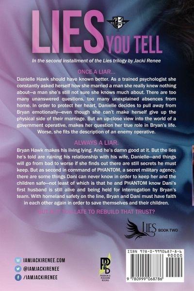 In the second installment of the Lies trilogy by Jacki Renée Once a liar... Danielle Hawk should have known better. As a trained psychologist, she constantly asked herself how she married a man she really knew nothing about-a man she's still not sure she knows much about. There are too many unanswered questions, too many unexplained absences from home. In order to protect her heart, Danielle decides to pull away from Bryan emotionally-even though she can't make herself give up the physical side of their marriage. But an up-close view into the world of a government operative, makes her question her true role in Bryan's life. Worse, she fits the description of an enemy operative. Always a liar... Bryan Hawk makes his living lying. And he's damn good at it. But the lies he's told are ruining his relationship with his wife, Danielle-and things will go from bad to worse if she finds out there are still secrets he must keep. But as second in command of PHANTOM, a secret military agency, there are some things Dani can never know in order to keep her and the children safe-not least of which is that he and PHANTOM know Dani's first husband is still alive and being held for interrogation by Bryan's team. With homeland safety on the line, Bryan and Dani must have faith in each other again in order to save themselves and their children. But is it too late to rebuild that trust?