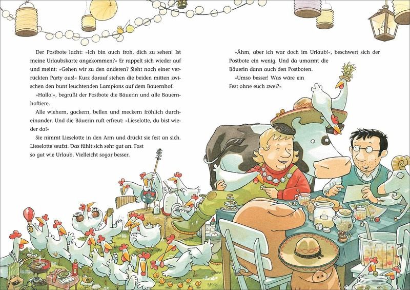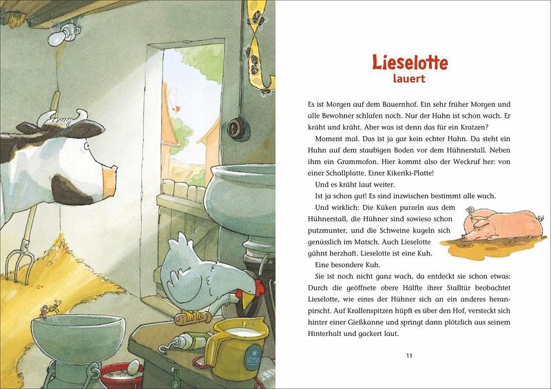 Warum ist Kuh Lieselotte so eine gute Erschreckerin und lauert so gern dem Postboten auf? Und wie um alles in der Welt ist es passiert, dass Lieselotte beim Versteckspielen hoch oben in der Baumkrone landet? Auch die Schatzsuche auf dem Bauernhof endet sehr überraschend. Während am Abend alle ins Bett gehen wollen, nervt Lieselotte und raubt allen den Schlaf. Und alleine in den Urlaub fahren, ist auch so eine Sache.
