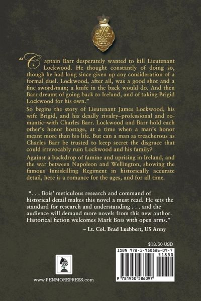 xCaptain Barr desperately wanted to kill Lieutenant Lockwood. He thought constantly of doing so, though he had long since given up any consideration of a formal duel. Lockwood, after all, was a good shot and a fine swordsman; a knife in the back would do. And then Barr dreamt of going back to Ireland, and of taking Brigid Lockwood for his own." So begins the story of Lieutenant James Lockwood, his wife Brigid, and his deadly rivalry – professional and romantic – with Charles Barr. Lockwood and Barr hold each other’s honor hostage, at a time when a man’s honor meant more than his life. But can a man as treacherous as Charles Barr be trusted to keep secret the disgrace that could irrevocably ruin Lockwood and his family? Against a backdrop of famine and uprising in Ireland, and the war between Napoleon and Wellington, showing the famous Inniskilling Regiment in historically accurate detail, here is a romance for the ages, and for all time. "… Bois’ meticulous research and command of historical detail makes this novel a must read. He sets the standard for research and understanding… and the audience will demand more novels from this new author. Historical fiction welcomes Mark Bois with open arms." – Lt. Col. Brad Luebbert, US Army
