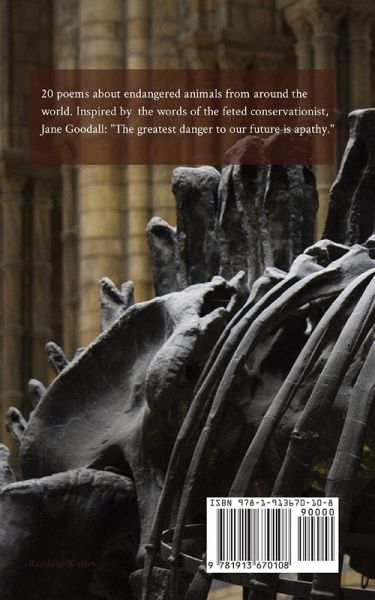 20 poems about endangered animals from around the world. Inspired by the words of the feted conservationist, Jane Goodall: "The greatest danger to our future is apathy." Since animals cannot speak for themselves it is down to us to make their case for survival heard.