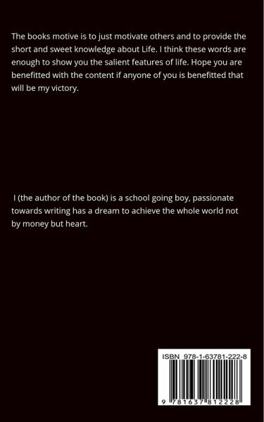 The books motive is to just motivate others and to provide the short and sweet knowledge about Life. I have tried to open the mysteries of life in the book in a very short way so that you will always be energetic to read the book and not be bored. I think these words are enough to show you the salient features of life. Hope you are benefitted with the content if anyone of you is benefitted that will be my victory.