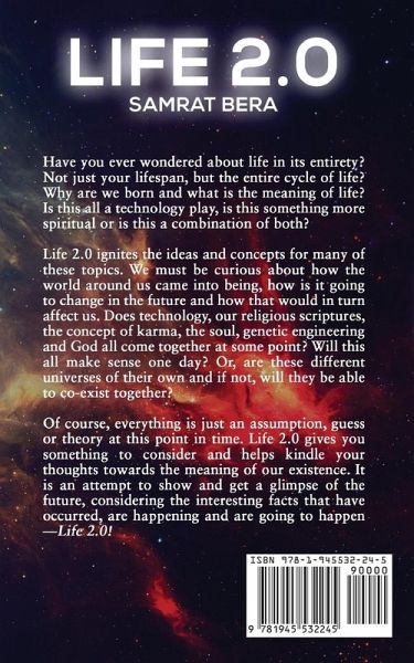 Have you ever wondered about life in its entirety? Not just your lifespan, but the entire cycle of life? Why are we born and what is the meaning of life? Is this all a technology play, is this something more spiritual or is this a combination of both? Life 2.0! ignites the ideas and concepts for many of these topics. We must be curious about how the world around us came into being, how is it going to change in the future and how that would, in turn, affect us. Does technology, our religious scriptures, the concept of karma, the soul, genetic engineering and God all come together at some point? Will this all make sense one day? Or, are these different universes of their own and if not, will they be able to co-exist together? Of course, everything is just an assumption, guess or theory at this point in time. Life 2.0! gives you something to consider and helps kindle your thoughts towards the meaning of our existence. It is an attempt to show and get a glimpse of the future, considering the interesting facts that have occurred, are happening and are going to happen - Life 2.0!
