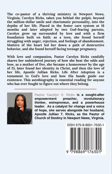 The co-pastor of a thriving ministry in Newport News, Virginia, Carolyn Ricks, takes you behind the pulpit, beyond the million-dollar smile and charismatic personality, into the depths of her life. Placed in the foster care system at 18 months and later adopted by two God-fearing parents, Carolyn grew up surrounded by love and with a firm foundation built on faith; as a teen, she found herself struggling with anger, rejection, and feelings of abandonment. Matters of the heart led her down a path of destructive behavior, and she found herself facing teenage pregnancy. With love and compassion, Pastor Carolyn Ricks candidly shares her unhindered journey of how she beat the odds and how, as a mother of five, she became a homeowner by the age of 25, later found her identity in Christ, and then the love of her life, Apostle Jullian Ricks. Life After Adoption is a testament to God's love and how His hands guide our existence. This autobiography is essential reading for anyone who has ever fought to figure out where they belong.