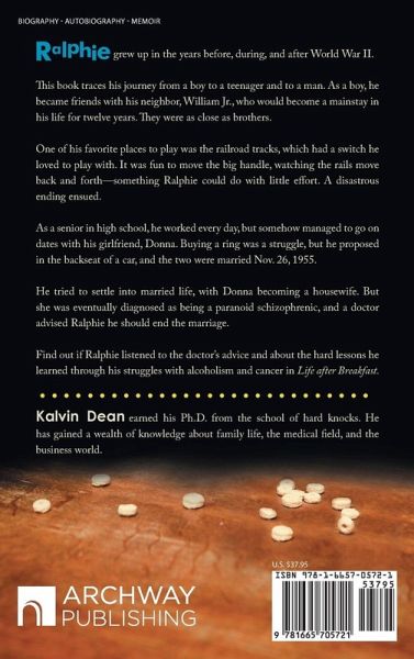 Ralphie grew up in the years before, during, and after World War II. This book traces his journey from a boy to a teenager and to a man. As a boy, he became friends with his neighbor, William Jr., who would become a mainstay in his life for twelve years. They were as close as brothers. One of his favorite places to play was the railroad tracks, which had a switch he loved to play with. It was fun to move the big handle, watching the rails move back and forth-something Ralphie could do with little effort. A disastrous ending ensued. As a senior in high school, he worked every day, but somehow managed to go on dates with his girlfriend, Donna. Buying a ring was a struggle, but he proposed in the backseat of a car, and the two were married Nov. 26, 1955. He tried to settle into married life, with Donna becoming a housewife. But she was eventually diagnosed as being a paranoid schizophrenic, and a doctor advised Ralphie he should end the marriage. Find out if Ralphie listened to the doctor's advice and about the hard lessons he learned through his struggles with alcoholism and cancer in Life after Breakfast.
