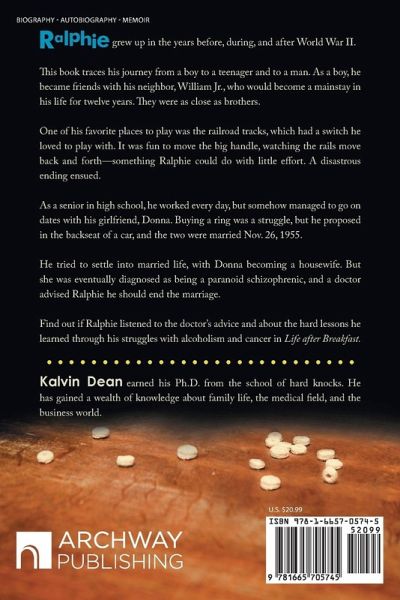 Ralphie grew up in the years before, during, and after World War II. This book traces his journey from a boy to a teenager and to a man. As a boy, he became friends with his neighbor, William Jr., who would become a mainstay in his life for twelve years. They were as close as brothers. One of his favorite places to play was the railroad tracks, which had a switch he loved to play with. It was fun to move the big handle, watching the rails move back and forth-something Ralphie could do with little effort. A disastrous ending ensued. As a senior in high school, he worked every day, but somehow managed to go on dates with his girlfriend, Donna. Buying a ring was a struggle, but he proposed in the backseat of a car, and the two were married Nov. 26, 1955. He tried to settle into married life, with Donna becoming a housewife. But she was eventually diagnosed as being a paranoid schizophrenic, and a doctor advised Ralphie he should end the marriage. Find out if Ralphie listened to the doctor's advice and about the hard lessons he learned through his struggles with alcoholism and cancer in Life after Breakfast.